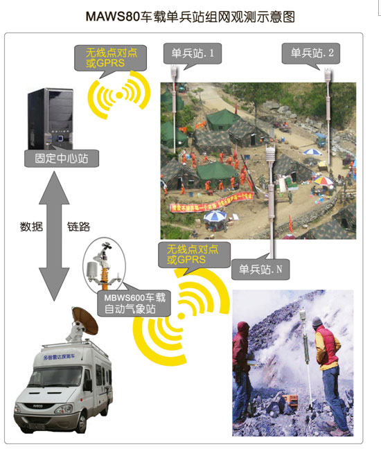 重大應急現場面積分布較廣,必須進行多點組網觀測,MAWS80-WT迷你站結構輕巧緊湊,可以快速完成現場組網協同觀測,并通過無線點對點或GPRS通信方式將數據傳輸至應急車載指揮中心及固定中心站,是掌握應急觀測現場第一手數據的必備手段。 |