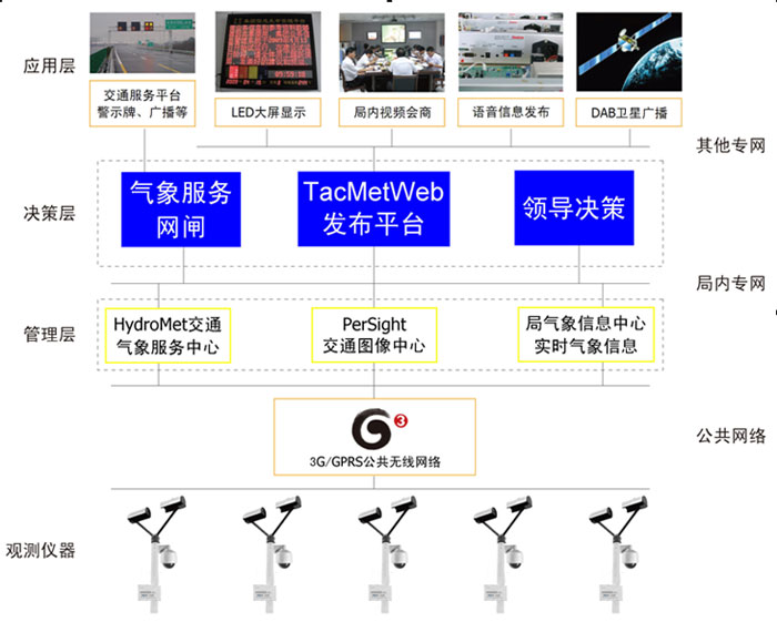 交通環(huán)境監(jiān)測系統(tǒng),主要實現(xiàn)雨、雪、霧(能見度)等綜合天氣現(xiàn)象的實況監(jiān)測預警和現(xiàn)場實時視頻圖像的獲得。包括雨、雪、霧等所有天氣現(xiàn)象的代碼,降水過程的滴譜;觀測低能見度范圍的精確數(shù)據(jù)(主要在5千米以內(nèi)),預警影響交通的能見度精確數(shù)據(jù)(500米內(nèi)),解決影響交通安全關鍵的氣象因素的實況監(jiān)測與預警問題。建立公路氣象觀測模型,天氣狀態(tài)監(jiān)測和實景監(jiān)控相結(jié)合,給決策者提供第一手的真實數(shù)據(jù),給出相應的預警發(fā)布信息,達到公路氣象服務的目的。
