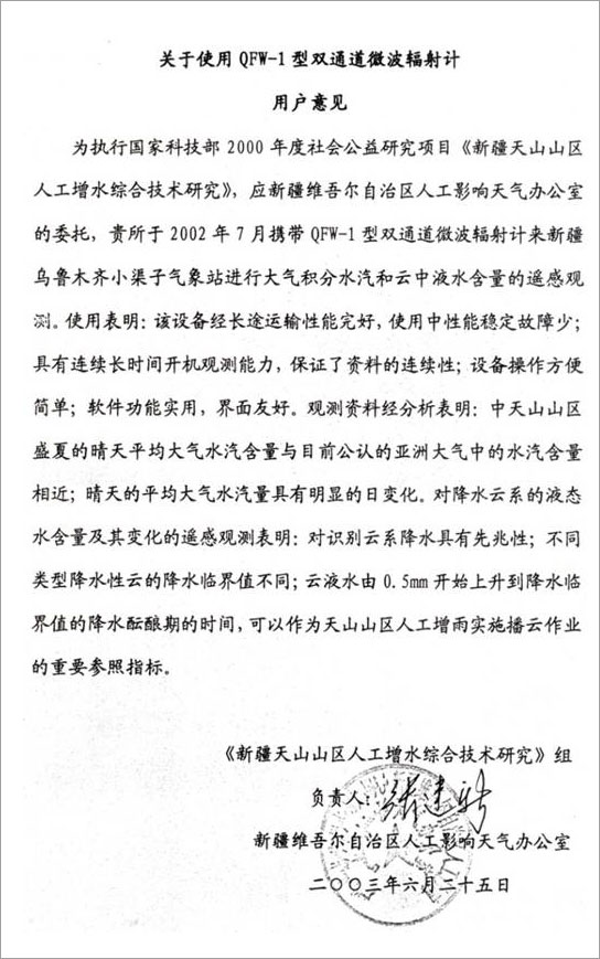 為執行國家科技部2000年度社會公益研究項目《新疆天山山區人工增水綜合技術研究》,應新疆維吾爾自治區人工影響天氣辦公室的委托,貴所于2002年7月攜帶QFW-1型雙通道微波輻射計來新疆烏魯木齊小渠子氣象站進行大氣積分水汽和云中液水含量的遙感觀測。使用表明:該設備經長途運輸性能完好,使用中性能穩定故障少;具有連續長時間開機觀測能力,保證了資料的連續性;設備擦做方便簡單;軟件功能使用,界面美觀。觀測資料經分析表明:中天山山區盛夏的晴天平均大氣水汽含量與目前公認的亞洲大氣中的水汽含量相近;晴天的平均大氣水汽量具有明顯的日變化。對降水云系的業態水含量及其變化的遙感觀測表明:對識別云系降水具有先兆性;不同類型降水性云的降水臨界值不同;云液水由0.5mm開始上升到降水臨界值得降水醞釀期的時間,可以作為天山山區人工增雨實施播云作業的重要參照指標.